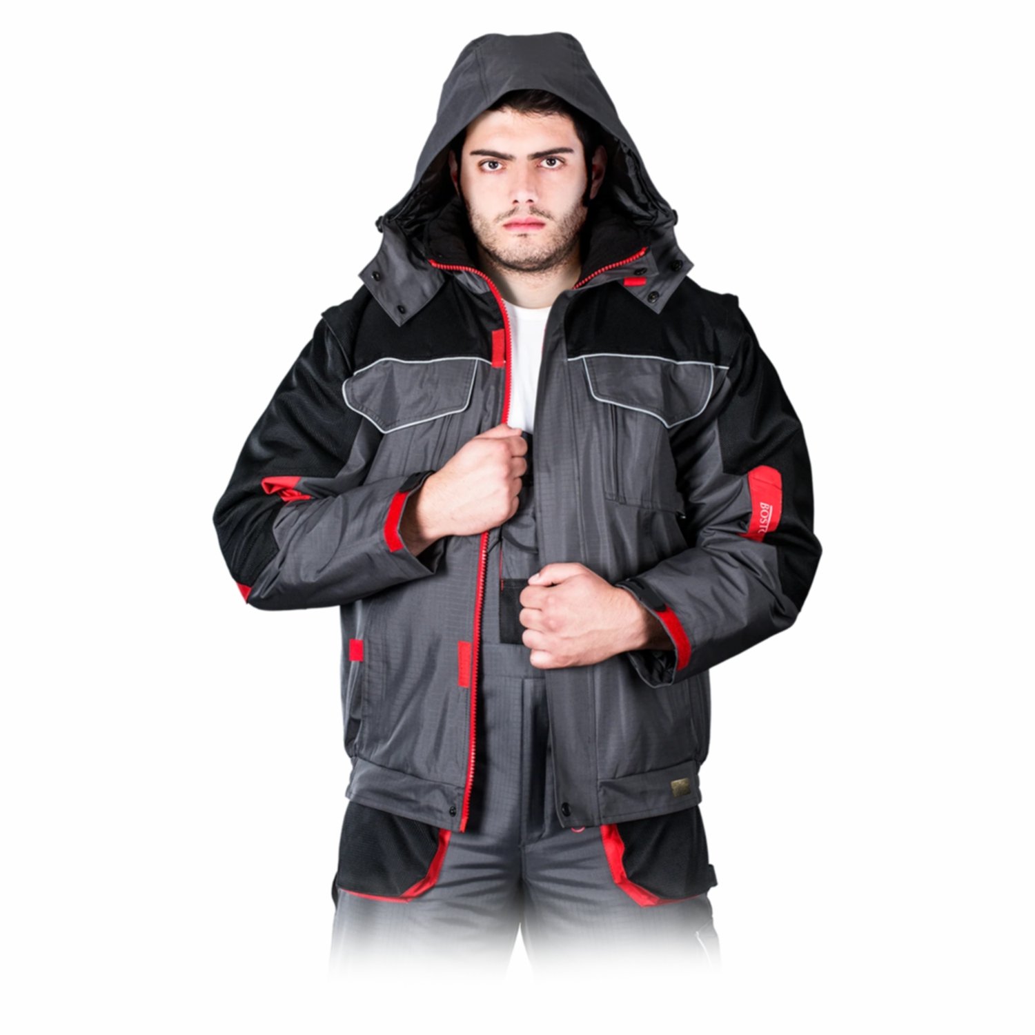 BOSTON žieminė striukė pagaminta iš plyšimui atsparaus RIP-STOP pongee tipo poliesterio su PVC danga (340 g/m²), kuris patikimai saugo nuo vėjo ir drėgmės. Sustiprintos OXFORD 720D poliesterio sritys pečių ir rankovių zonoje padidina ilgaamžiškumą. Vidinis fliso pamušalas ir papildomas šiltinimo sluoksnis užtikrina šilumą net dirbant žemoje temperatūroje. Striukė turi nuimamą ir reguliuojamą gobtuvą, nuimamas rankoves (galima dėvėti kaip liemenę), reguliuojamus rankogalius ir apačios gumą nuo vėjo. Funkcionalios išorinės ir vidinės kišenės leidžia patogiai laikyti įrankius ir asmeninius daiktus, o atšvaitiniai elementai pagerina matomumą.