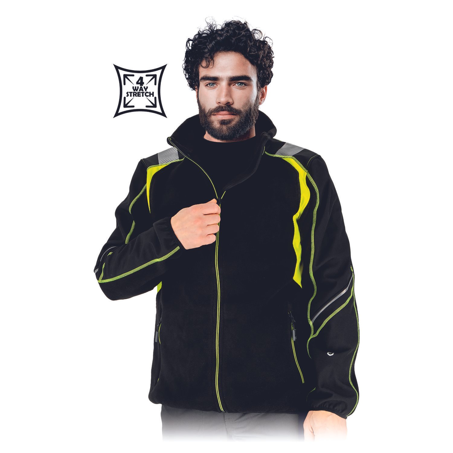 Džemperis užsegamas užtrauktuku, turi stovinčią apykaklę, dvi apatines kišenes su užtrauktukais ir elastingas juosteles rankogaliuose bei apačioje. Ryškios fluorescencinės spalvos ir segmentinės atšvaitinės juostos pagerina matomumą tamsiuoju paros metu. Tiesaus kirpimo (REGULAR) modelis suteikia patogią judėjimo laisvę.
