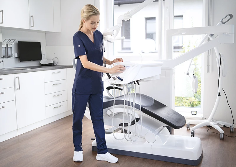 Moteriškas medicininės aprangos komplektas, sudarytas iš lengvos tunikos su V formos iškirpte ir patogių SLIP modelio darbo kelnių. Komplektas pagamintas iš tvaraus, lengvo ir patvaraus audinio, kuris užtikrina komfortą visos darbo dienos metu ir yra pritaikytas intensyviam naudojimui.