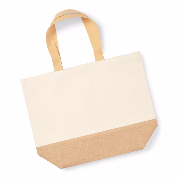 Džuto ir medvilnės drobės pirkinių krepšys – itin talpus ir patvarus daugkartinis krepšys, pagamintas iš laminuoto džuto pagrindo ir tvirtos medvilnės drobės. Storesnė „premium“ klasės medžiaga užtikrina ilgaamžiškumą, o lygus drobės paviršius puikiai tinka spaudai ar kitam dekoravimui. Patogios medvilninės rankenos leidžia nešioti tiek rankoje, tiek ant peties.