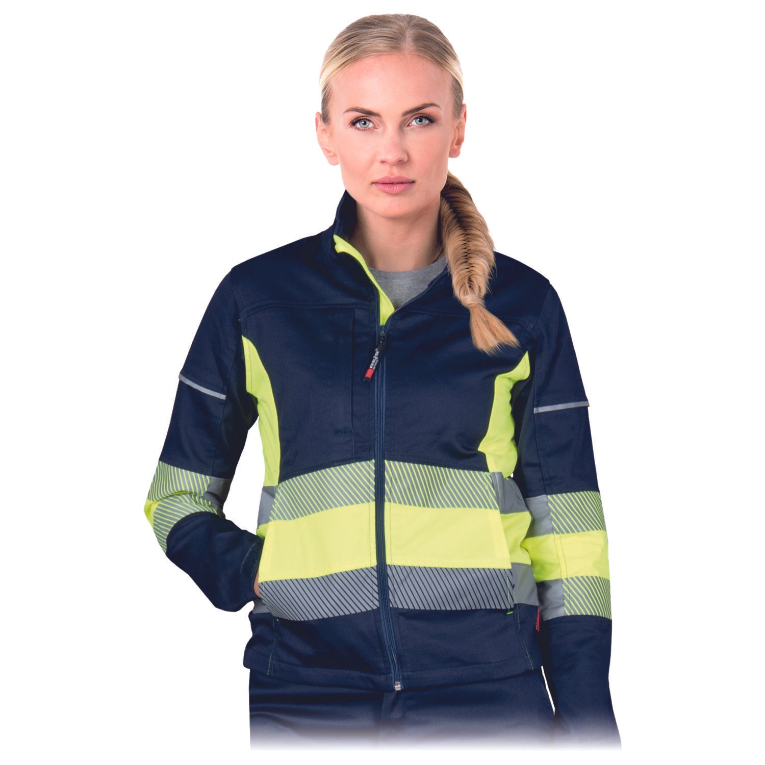 Moteriškas elastingas apsauginis darbo švarkas FRAUBAX, pagamintas iš patogaus ir tampraus audinio mišinio, užtikrinančio gerą judesių laisvę ir komfortą darbo metu. Atšvaitiniai elementai ir segmentuotos juostos pagerina matomumą, todėl džemperis tinkamas įvairioms darbo aplinkoms.