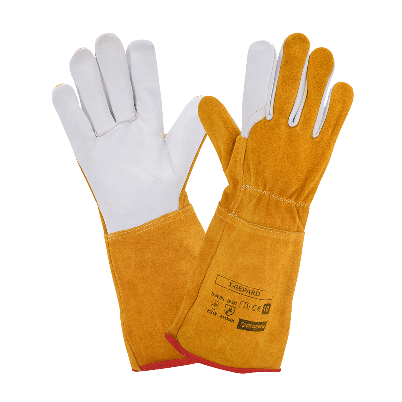 X-GEPARD pilnai odinės suvirinimo pirštinės. Visa delno suimamoji dalis pagaminta iš vientiso ožkos odos gabalo, ilgas rankogalis ir viršutinė dalis pagaminti iš medaus spalvos lygios odos. Siūtos ugniai atspariais KEVLAR siūlais. Ilgis 35 cm.