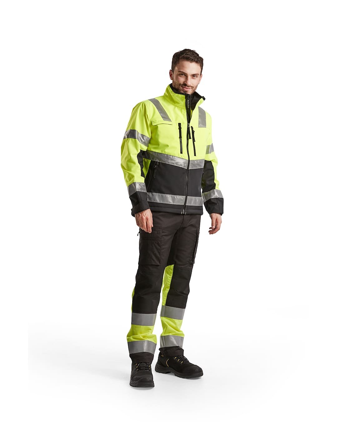 Moderni, vėjui ir vandeniui atspari signalinė softshell striukė, sukurta darbui statybose, transporte ir pramonėje. Trijų sluoksnių laminuota medžiaga užtikrina atsparumą lietui ir vėjui, išlaikant gerą kvėpavimą. Aukšta, plačiai suformuota apykaklė su minkštu flisiniu pamušalu suteikia išskirtinį komfortą. Pailginta nugaros dalis, reguliuojami rankogaliai ir apačia užtikrina patogų prigludimą, o gausios kišenės leidžia patogiai susidėti darbo reikmenis. 50 mm pločio atšvaitinės juostos ant liemens, rankovių ir pečių suteikia gerą matomumą. Striukė sertifikuota pagal EN ISO 20471 (2 klasė).
