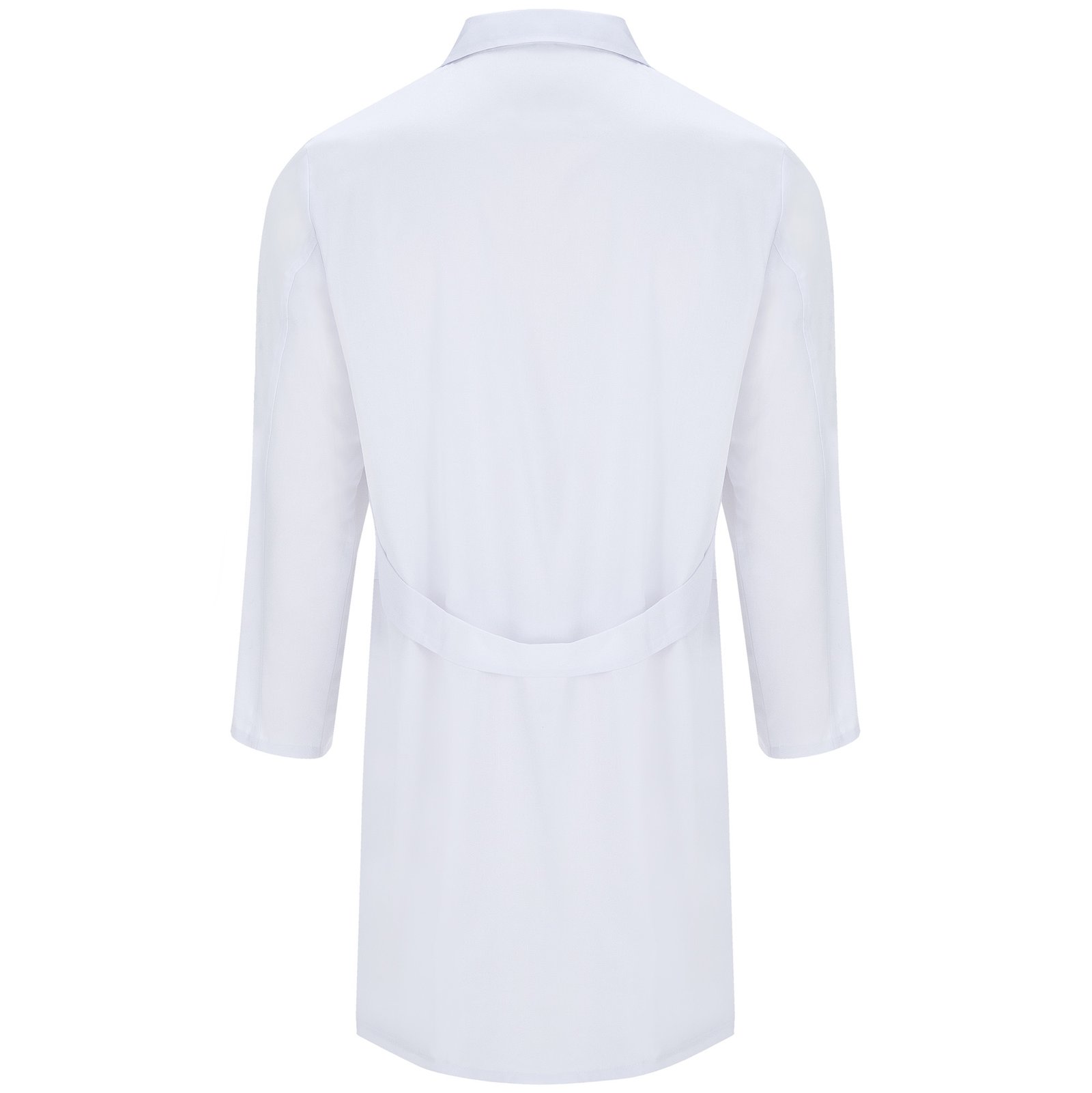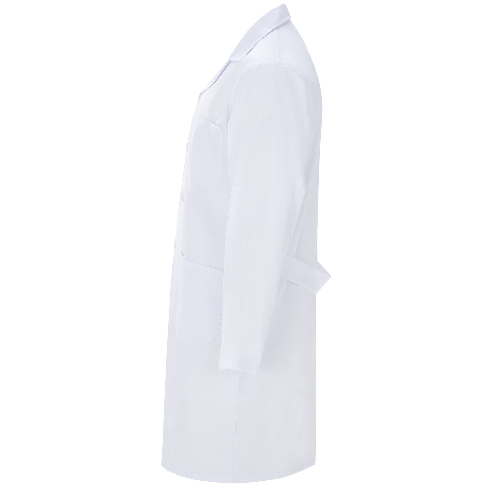Universalus medicininis chalatas su atlenkiamu apykaklės dizainu, užtikrinantis profesionalią išvaizdą ir komfortą darbo metu.