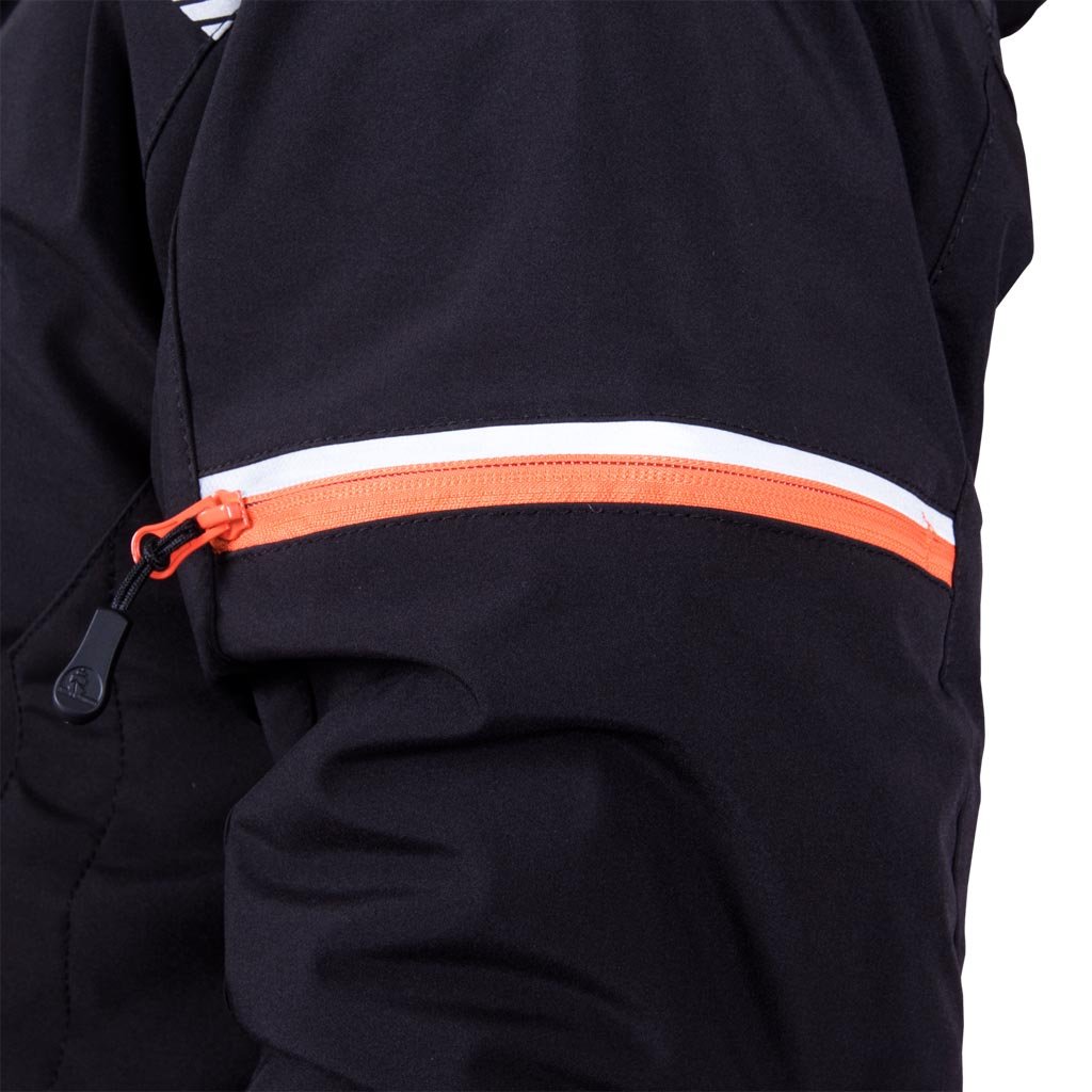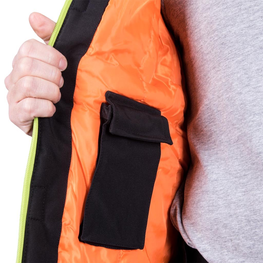 Kišenės: dvi apatinės ir dvi krūtinės kišenės su užtrauktuku; kišenė su užtrauktuku ant kairės rankovės; dvi vidinės kišenės su lipuku (viena skirta mobiliajam telefonui)