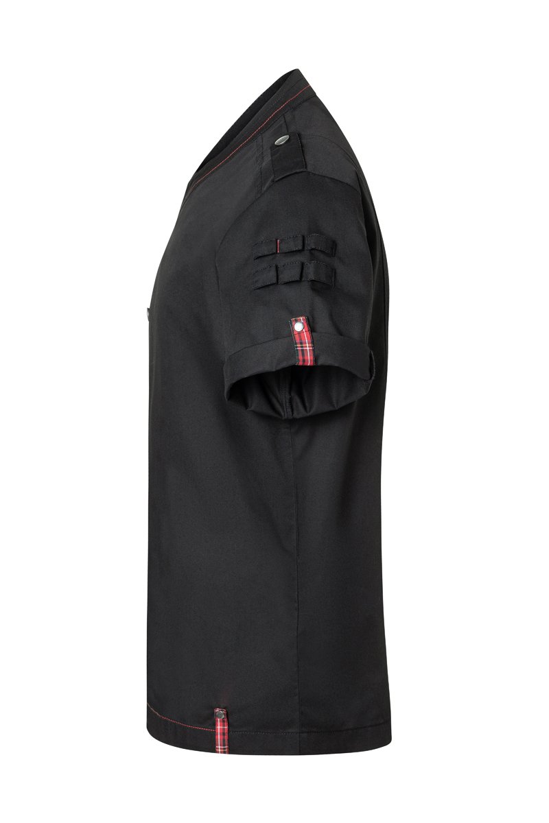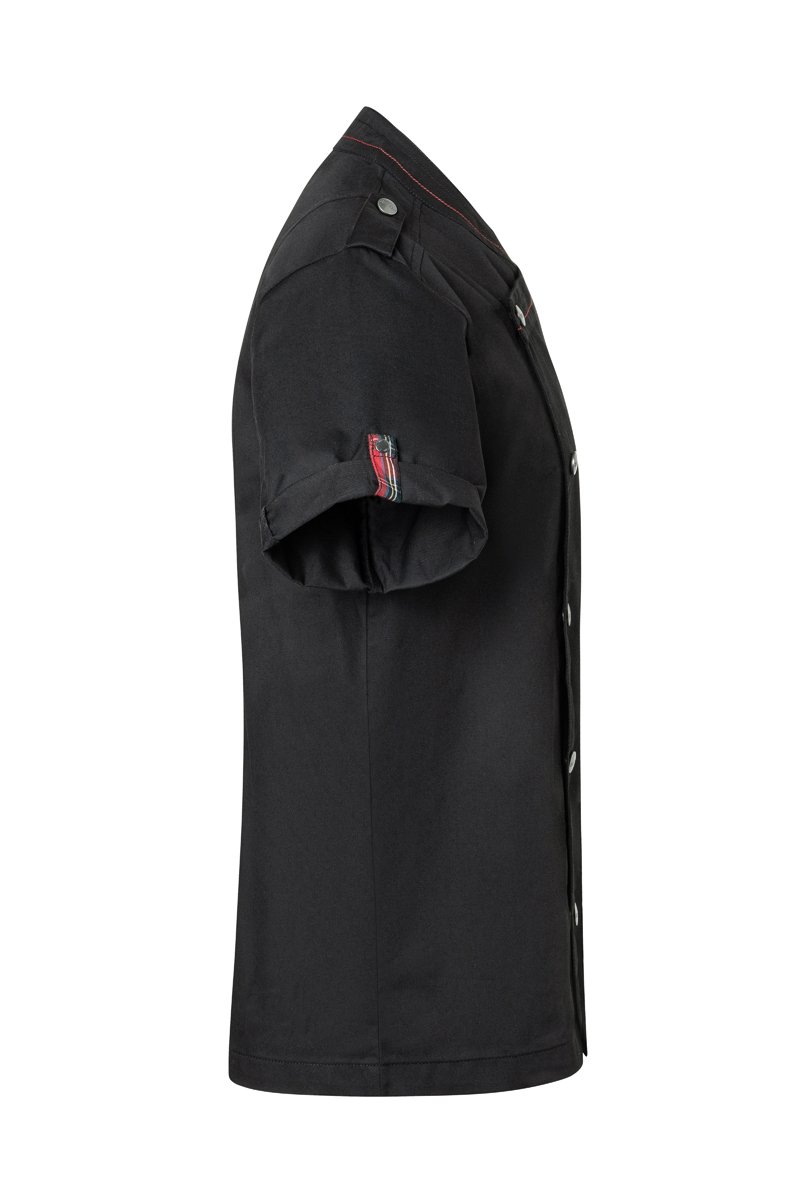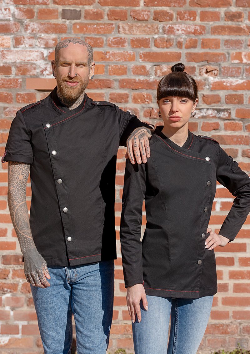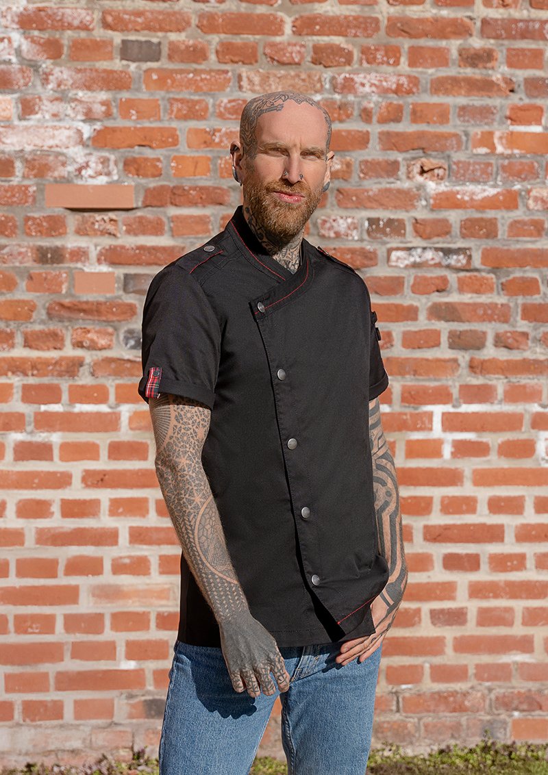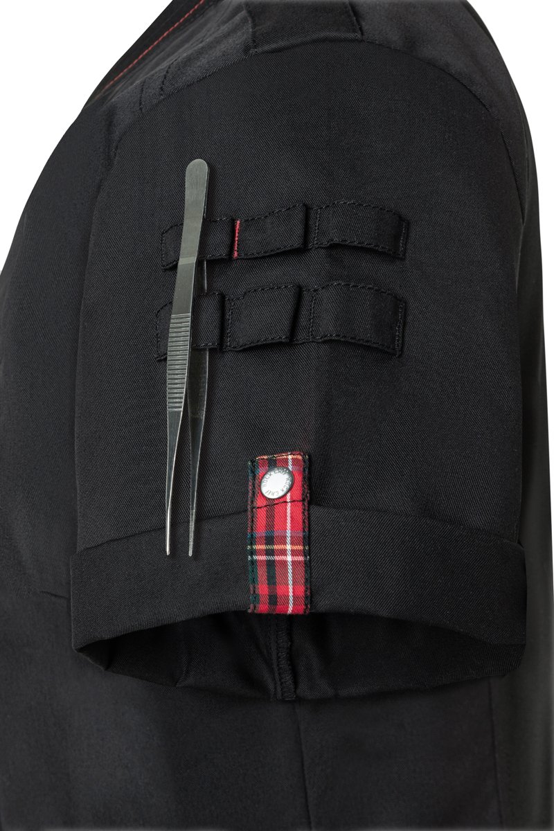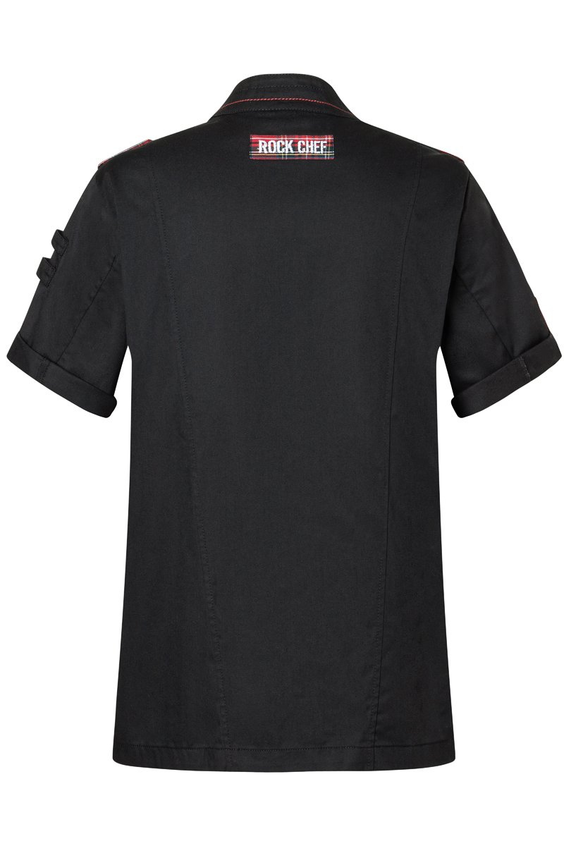 Stilingas, rock stiliaus įkvėptas vyriškas šefų švarkas trumpomis rankovėmis, išsiskiriantis unikaliu dizainu ir funkcionalumu. Tvilo audinys iš poliesterio ir medvilnės yra lengvas, patvarus, lengvai prižiūrimas ir apdorotas taip, kad nesitrauktų. Asimetriškas vienaeilis užsegimas su penkiomis spaudėmis leidžia greitai apsivilkti ar nusivilkti, o raudonos dekoratyvinės siūlės bei Glencheck rašto detalės suteikia išskirtinį ROCK CHEF® įvaizdį. Puikus pasirinkimas šefams, vertinantiems tiek patogumą, tiek išskirtinį stilių.