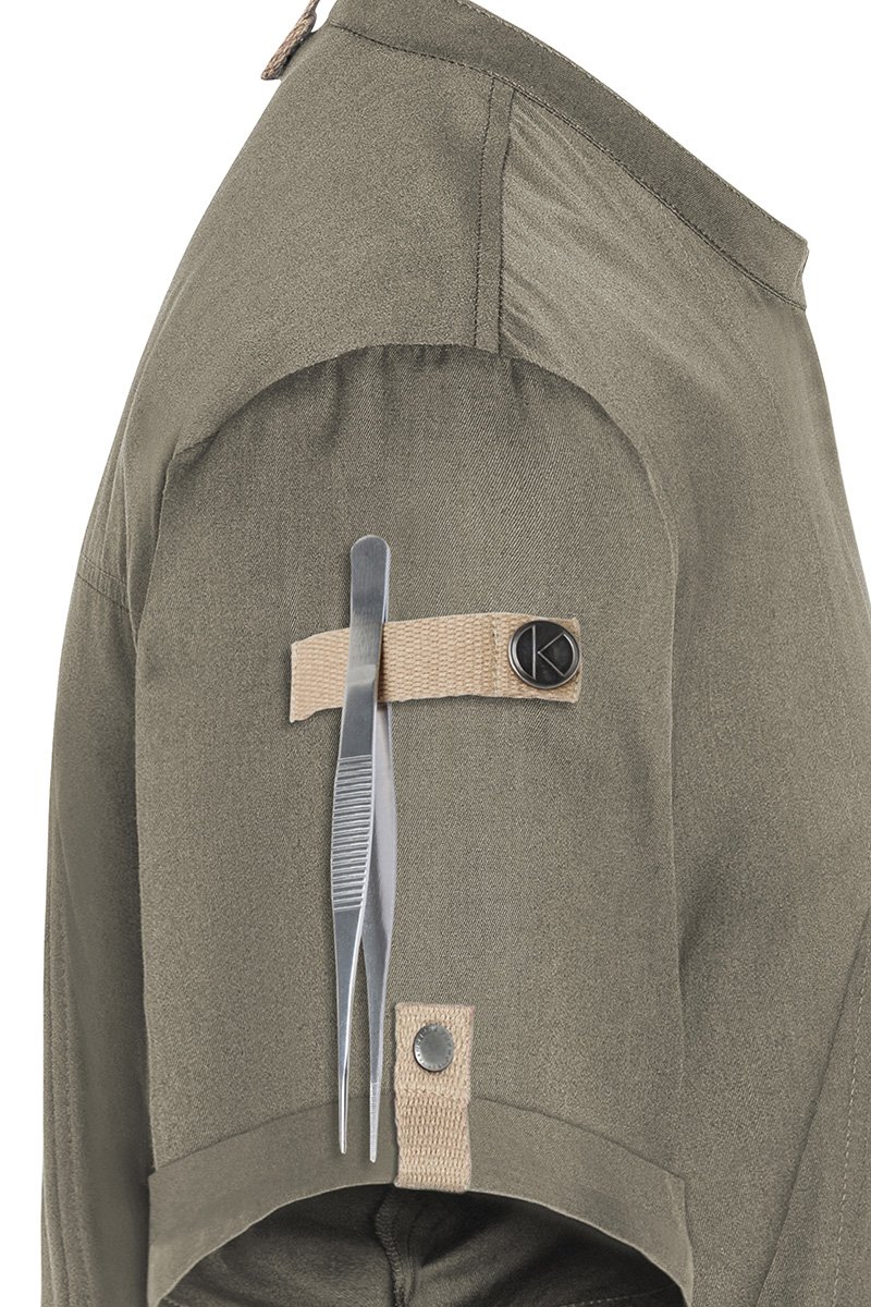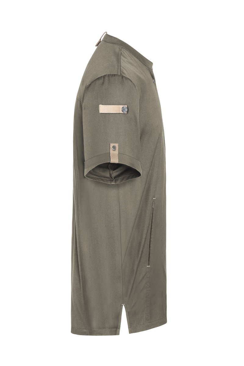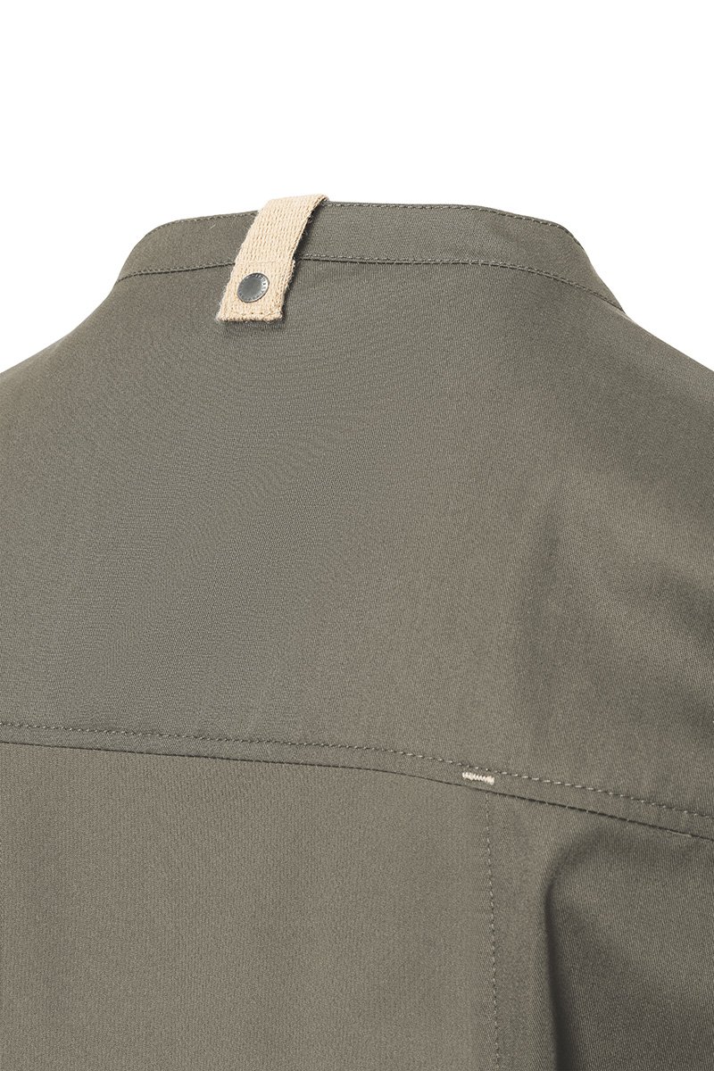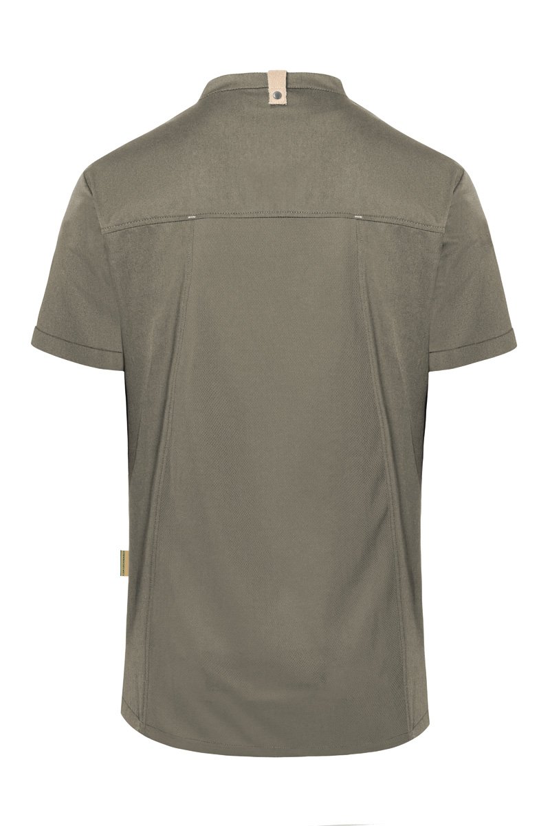 Modernus, tvarus ir itin patogus vyriškas šefo švarkas su trumpomis rankovėmis, sukurtas derinant miesto stilių ir profesionalaus darbo virtuvėje reikalavimus. Priekinė dalis pasiūta iš lengvo, spalvą išlaikančio drobinio audinio (65 % perdirbtas poliesteris / 35 % medvilnė, 150 g/m²), o nugaros dalis — iš kvėpuojančio, drėgmę reguliuojančio džersio pikė audinio (100 % perdirbtas poliesteris). Šis derinys užtikrina puikią ventiliaciją, malonią šilumos kontrolę ir didelę judėjimo laisvę.