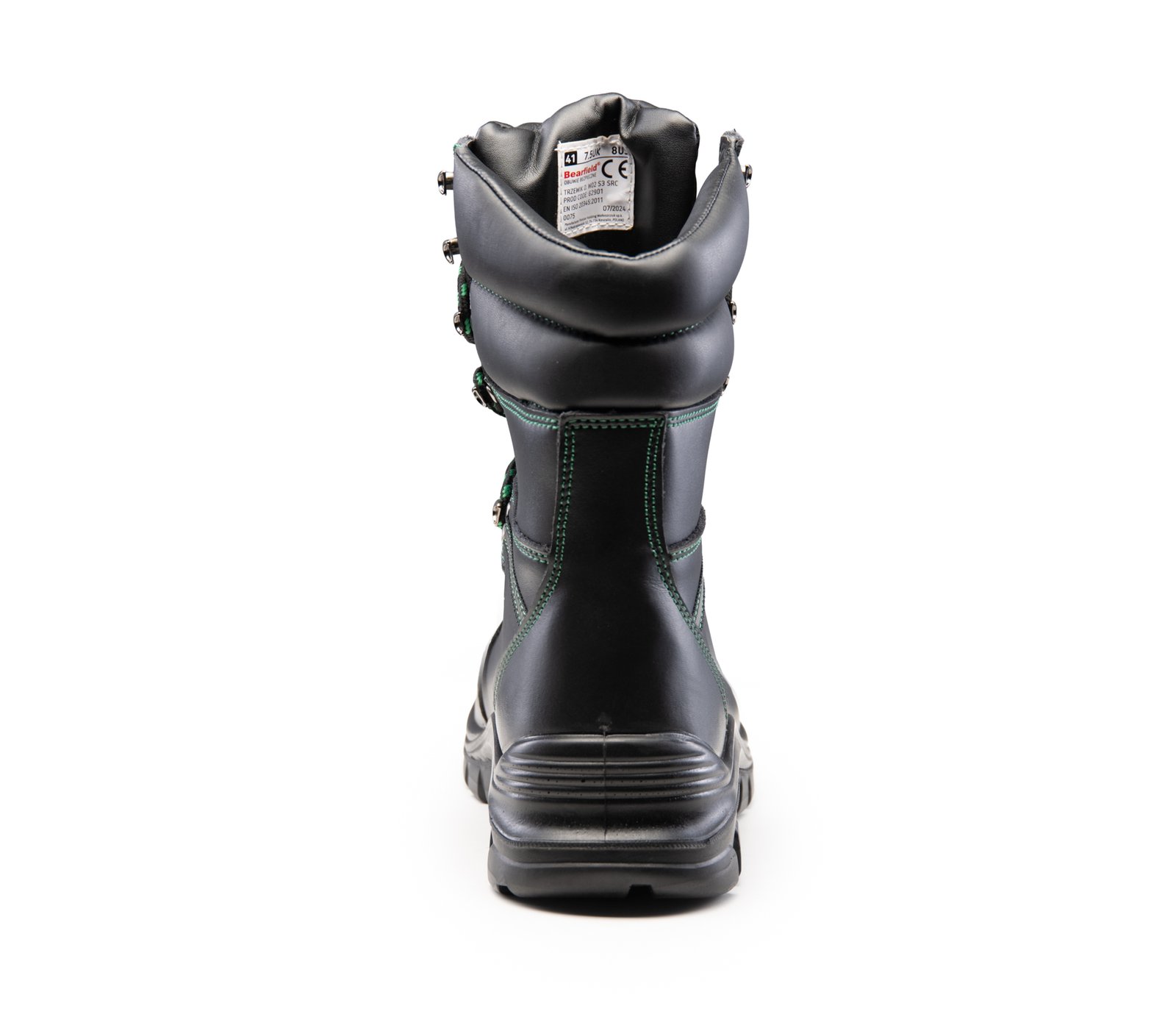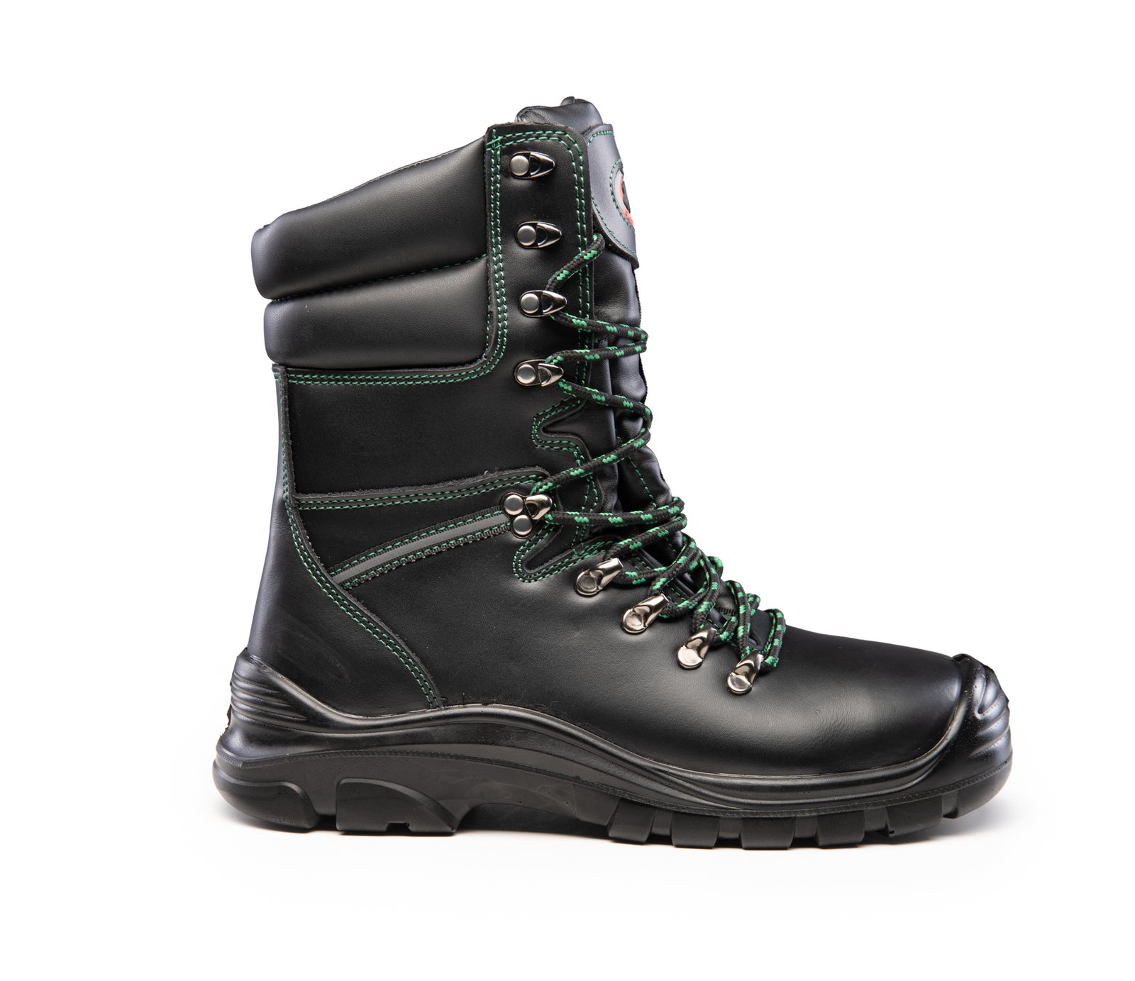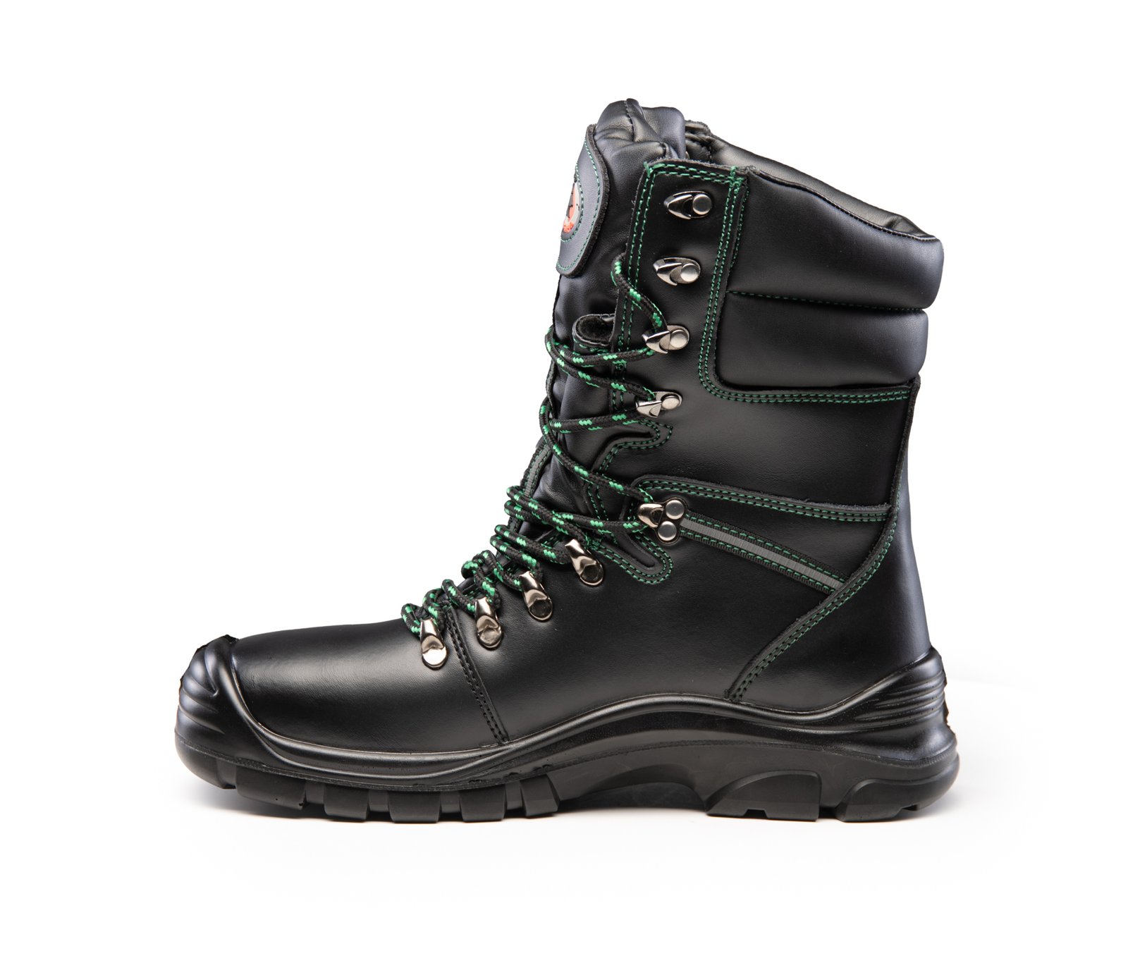 Patvarūs aukšti darbo batai sukurti apsaugai ir komfortui net atšiauriomis sąlygomis. Viršus pagamintas iš natūralios grūdėtos odos (1,8–2,0 mm storio) su padidintu atsparumu vandeniui – neleidžia įsigerti drėgmei iki 60 minučių. Juodos spalvos aulai dekoruoti kontrastingais žaliais siūlais, suteikiančiais modernų akcentą.